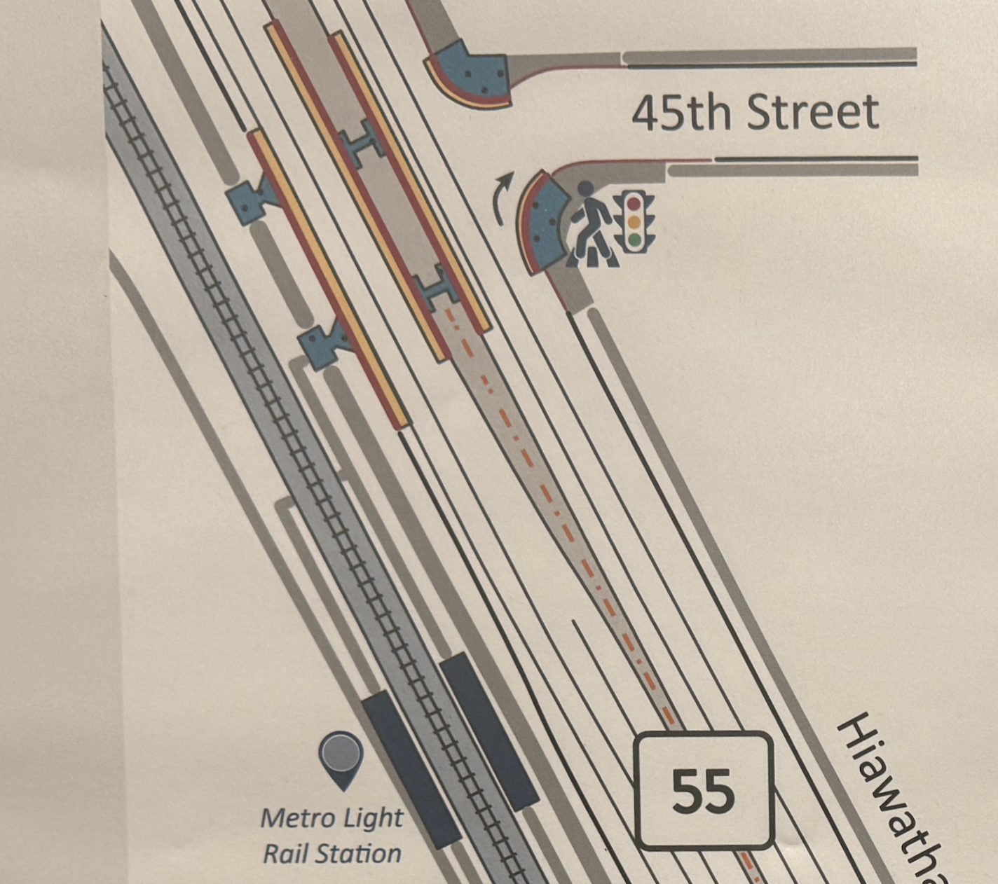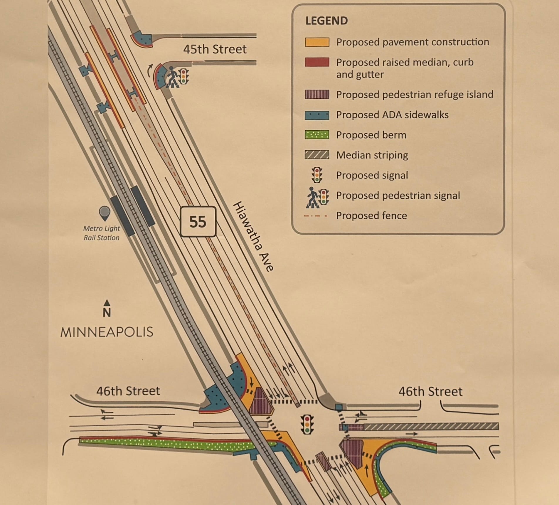 At a community meeting last night, the Minnesota Department of Transportation shared the latest designs for its planned changes to the 46th and Hiawatha intersection, which will remove lanes, add a new stoplight, and extend curbs to slow cars and shorten crossing distances for pedestrians. They plan to finalize the designs for the $2.6 million project this fall and begin construction next summer.