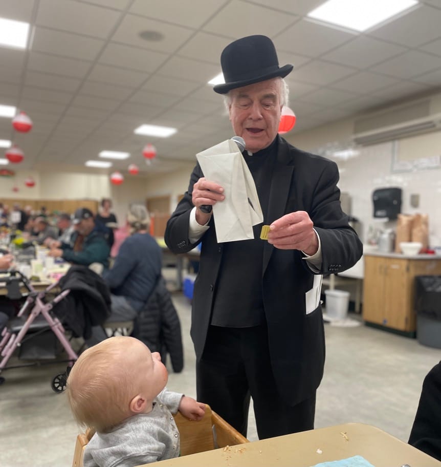 Which means that each week a hundred-some volunteers in a church basement have to pull off something that would be tough for any professional kitchen: Feeding a steady crush of (often) more than 1,000 people a dinner of fish, spaghetti, potatoes, hash browns, coleslaw, bread, milk, lemonade, coffee, and dessert. Plus running raffles, silent auctions, bingo, live music, and what amounts to a three-hour standup comedy routine from retired Pastor and southside native Father Joe Gillespie.