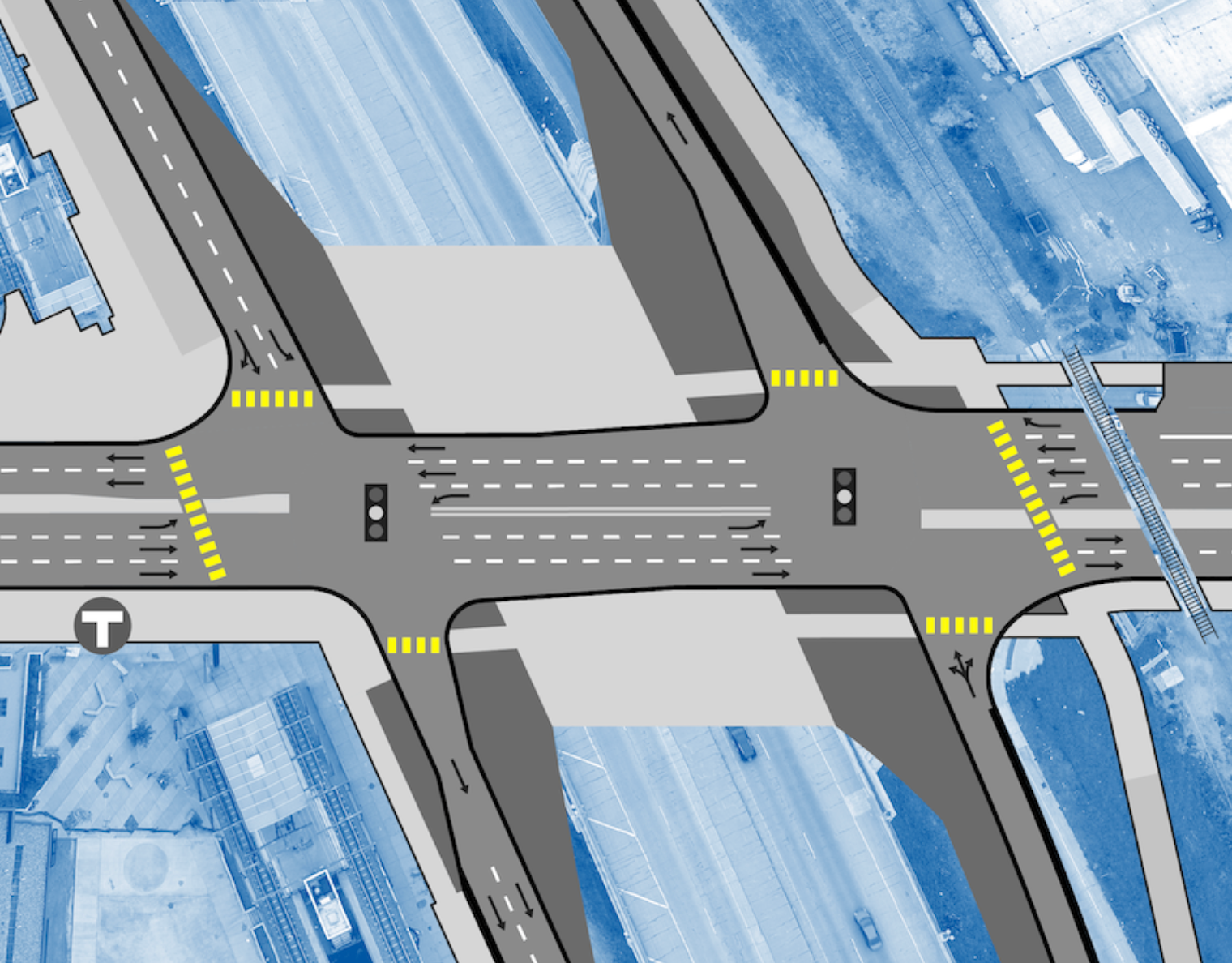The biggest change is to reconfigure the intersection into what's called a "tight diamond" design, which removes the splits on the entrance and exit ramps, and thus gets rid of the triangular pedestrian refuges (sometimes called "pork chops") that they create. The new intersection will also provide an island for cars to wait under the bridge, rather than having to make a long sweeping turn.