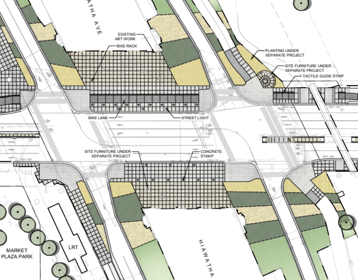 Bike path: The project will add a two-way protected bike path along the north side of Lake Street that ends at the respective shopping centers on either side of the intersection. The path intersects with the existing trail along the east side of Hiawatha Avenue, which connects to the Greenway and 32nd Street.
