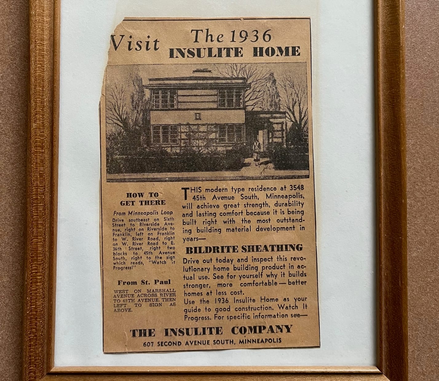 It was plainly obvious that their new home differed from its neighbors. But they didn't think much of it beyond that until, a few years after they moved in, a man knocked on the door and handed them a newspaper clipping. The man's father collected old home advertisements, and in the collection was a grainy drawing of their house with the headline, "Visit the 1936 Insulite Home." He thought they should have it.