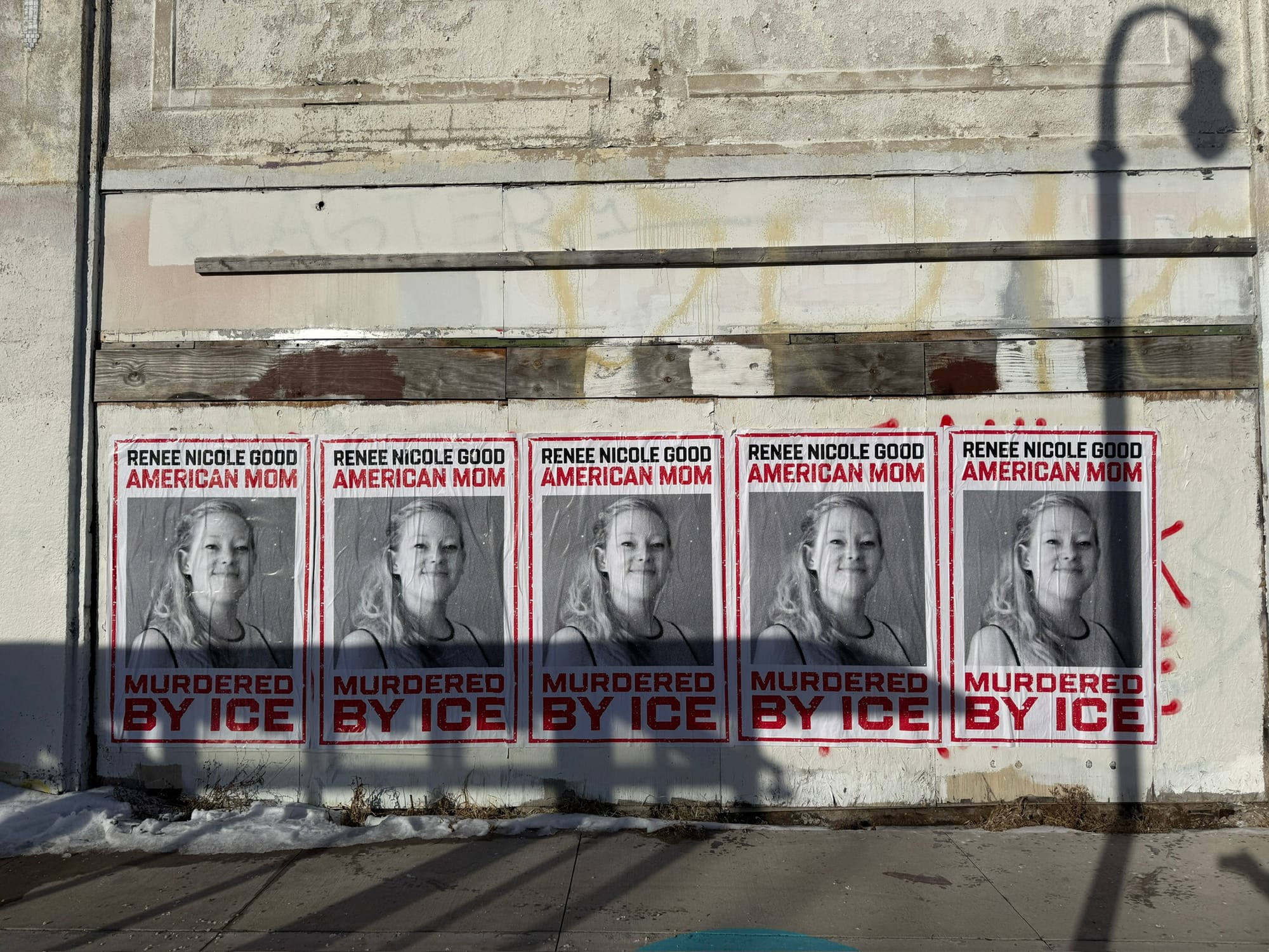 The New York Times, covering the same topic, featured a photo of the boarded-up exterior of the former Elsa's House of Sleep at 36th and Lake. Posters with the phrase "Renee Nicole Good / American Mom / Murdered by ICE" and a photo of Good appeared on the building shortly after her January 7 killing. The plywood boards, which have clad the former mattress and furniture store since 2020, have been a frequent canvas for postering and graffiti. The building has been condemned since June.