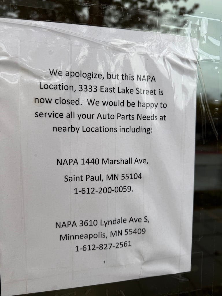 🚗 NAPA Auto Parts at 34th and Lake has closed. With the closure of O'Reilly Auto Parts in 2020, that leaves AutoZone at Lake and Minnehaha as the only auto parts shop left in the neighborhood. AutoZone's building is for sale, but the shop's lease runs through 2036.