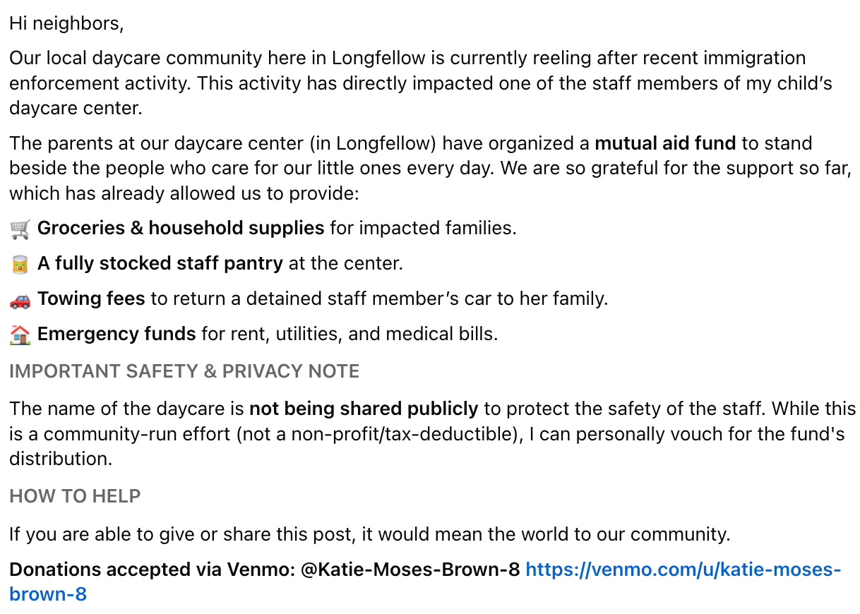 A group of parents at a neighborhood daycare, which has been a recurring target of ICE activity, is raising money to support staff at the center. You can contribute via Venmo.