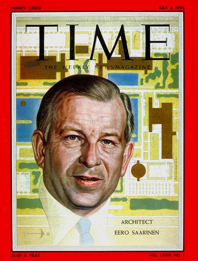 That man was Eero Saarinen, a Finnish-American modernist and son of another famous architect, Eliel Saarinen. Eero was the celebrity architect of the day, responsible for projects like the St. Louis Gateway Arch, Washington D.C.’s Dulles Airport, the American Embassy in London, and General Motors’ headquarters outside of Detroit. In what was one of the midcentury's highest cultural honors, his face had recently graced the cover of Time Magazine.