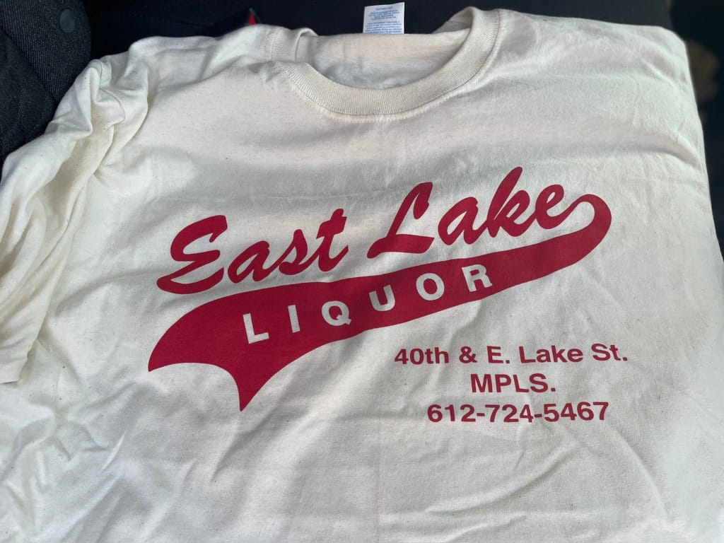 About 20 years ago owner Matt Lerner, a third-generation Minneapolis liquor store proprietor, began providing the shirts to softball teams that the store sponsored. It was a simple design in the style of rec-league teams everywhere: The name in cursive, with a banner swooping down from the last letter to display the final word. He doesn't remember exactly how the original graphic came about; it may have been a stock design from the t-shirt printer.